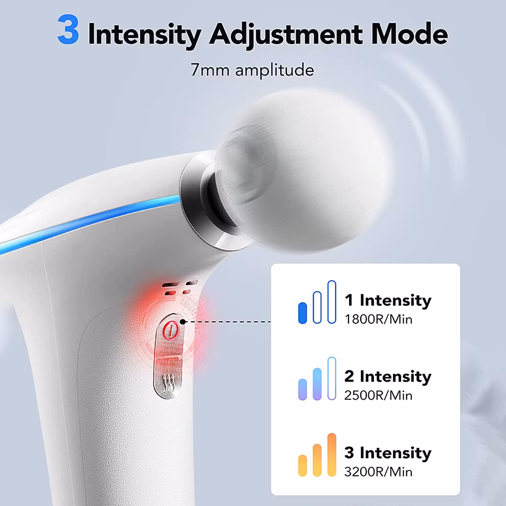 - ✅ 3 massager – välj mellan 3 intensitetsnivåer den muskelmassage som passar dig. Massagepistol kan nå muskelgrupperna på ett djup av 6 mm för att främja återhämtning av djupa vävnadsmuskler